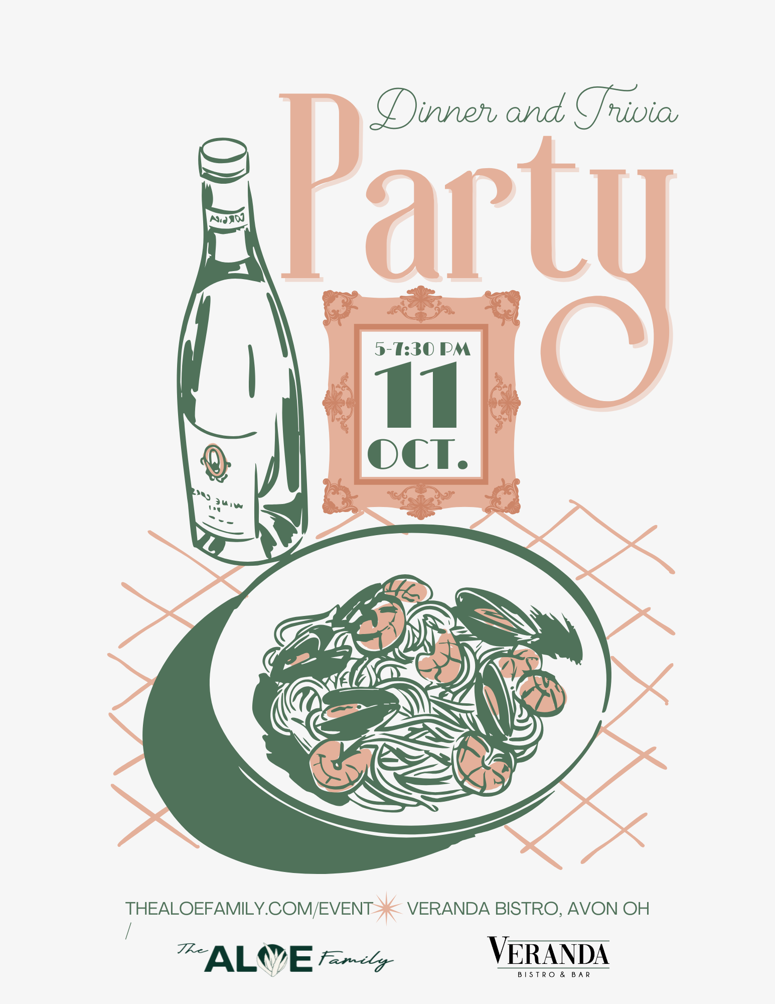 Join us at Veranda Bistro on October 11th at 5 PM for dinner, drinks, guest speakers, trivia, and a night of fun celebrations as we raise money and awareness for The Aloe Family who provides opportunities for education, job skills training, and hope and healing for resilient individuals facing challenges of poverty due to lack of resources and family support.